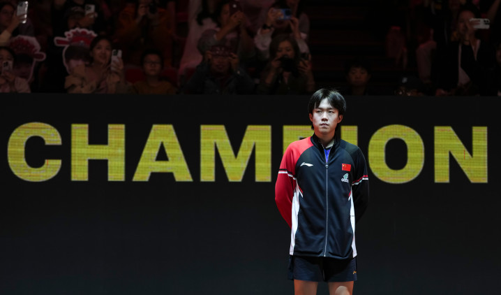 10月5日,在北京举行的2025年世界乒乓球职业大联盟(WTT)中国大满贯赛男子单打决赛中,王楚钦获得冠军。新华社记者 孙非 摄